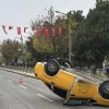 Çarpışmanın etkisiyle direksiyon hakimiyetini kaybeden taksi refüje çarparak devrildi.