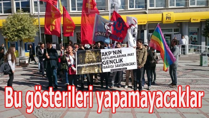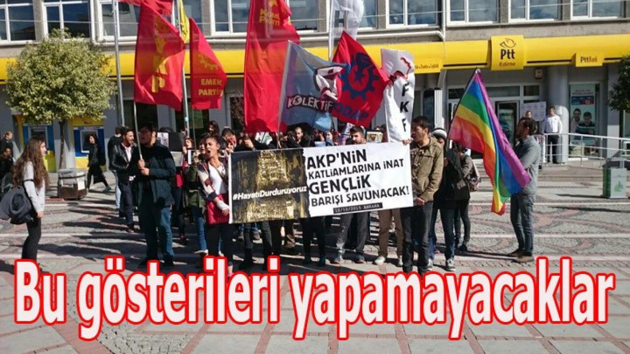 Son yaşanan olaylar nedeni ile tüm gösteri, yürüyüş ve diğer eylemler Valilik oluru ile yasaklandı. Konu ile ilgili yapılan açıklamada “Ülke genelinde 04 Kasım 2016 tarihinde güvenlik güçlerimizce yapılan operasyonlarda, haklarında yakalama kararı bulunan (15) HDP (Halkların Demokratik Partisi) Milletvekilinden (11)`i gözaltına alınmış, beraberinde PKK/KCK terör örgütü tarafından üstlenilen, Diyarbakır ilimizde meydana gelen bombalı araç saldırısı sonucunda vatandaşlarımız ve güvenlik görevlilerimizden şehit ve yaralananlar olmuştur. 2935 sayılı Olağanüstü Hal Kanununun 11/m ve 14/c maddeleri ile 5442 sayılı İl İdaresi Kanununun 11/C maddesi gereğince; İlimizde geçmiş yıllarda meydana gelmiş toplumsal olaylar göz önüne alındığında karşı karşıya gelebilecek karşıt gruplar arasında çatışmaların olabileceği değerlendirilerek, Ülkemiz genelinde HDP (Halkların Demokratik Partisi) Milletvekillerine yönelik yapılan operasyonlar ve Diyarbakır ilinde meydana gelen bombalı terör saldırıları ile ilgili olarak çeşitli gruplarca yapılmak istenen Protesto Eylemi, Oturma Eylemi, Basın Açıklaması, Yürüyüş, Stant Kurma, İmza Kampanyası ve Bildiri Dağıtma vb. etkinlikleri, 04 Kasım 2016 ile 30 Kasım 2016 tarihleri arasında Valilik Makamının 04/11/2016 tarih ve 2016/240 sayılı Olur`larıyla Edirne İl Genelinde Yasaklanmıştır.” denildi.