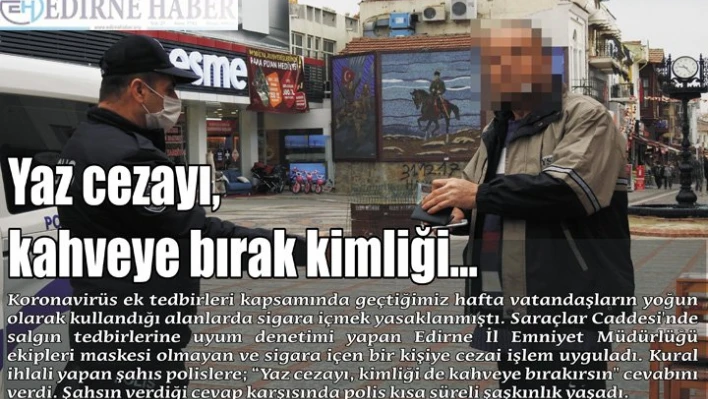 Koronavirüs ek tedbirleri kapsamında geçtiğimiz hafta vatandaşların yoğun olarak kullandığı alanlarda sigara içmek yasaklanmıştı. Saraçlar Caddesi'nde salgın tedbirlerine uyum denetimi yapan Edirne İl Emniyet Müdürlüğü ekipleri maskesi olmayan ve sigara içen bir kişiye cezai işlem uyguladı.Kural ihlali yapan şahıs polislere 'Yaz cezayı, kimliği de kahveye bırakırsın"cevabını verdi. Şahsın verdiği cevap karşısında polis kısa süreli şaşkınlık yaşadı.